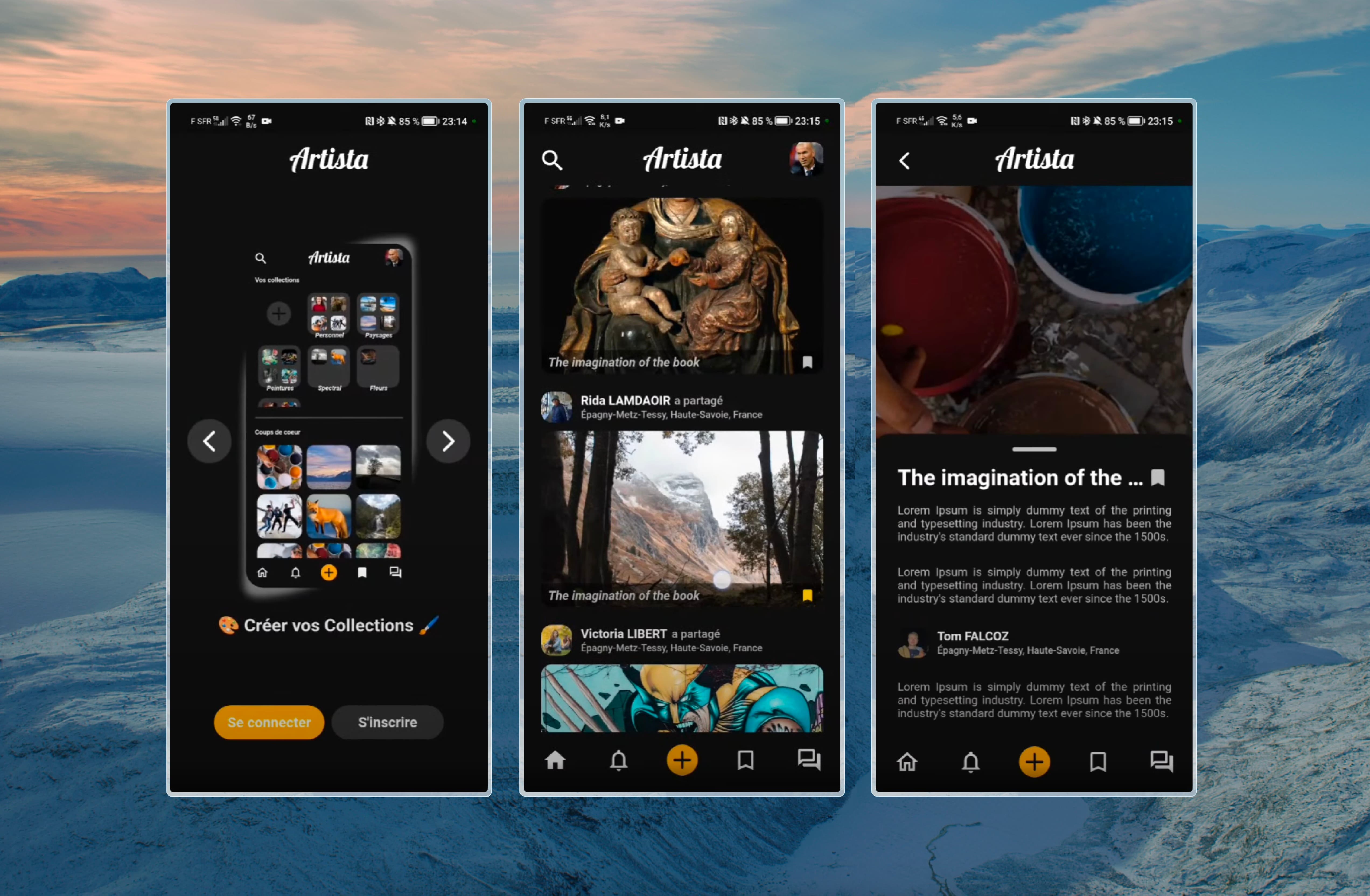 The project consists of the creation of a new mobile application specialised for artists where they can post their works, demonstrations, exhibitions, etc. Indeed, the objective of this new social network is to popularise art among the largest number of people. The aim is also to highlight all types of art, because when we think of this word, we often think of a picture, a painting, so it is visual art. But it is not the only one, there is also auditory art with music, jingles; and also audiovisual art with more “immersive” experiences. Different roles will be set up for this social network: User, Artist and Administrator.