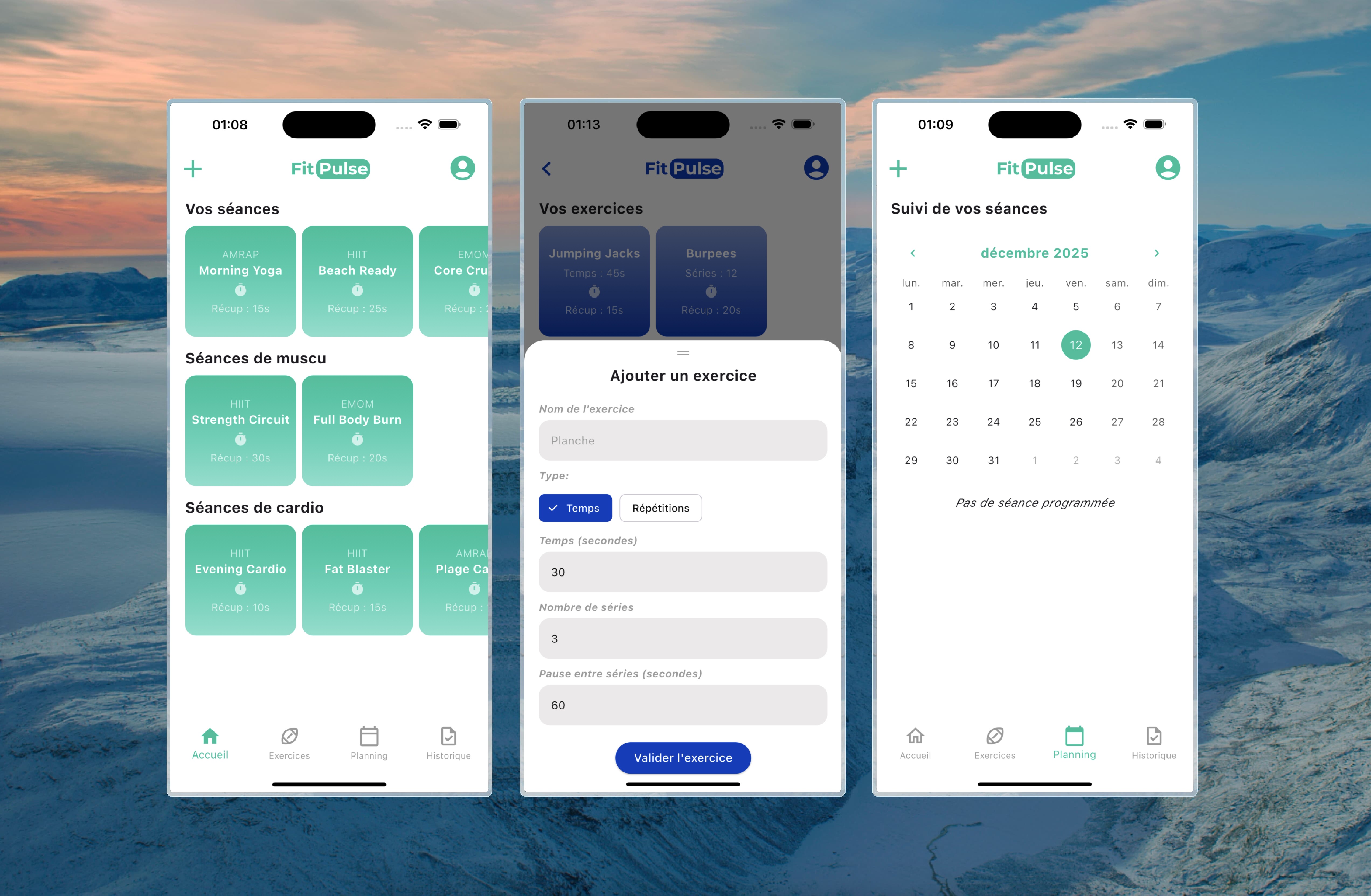The project consists of the creation of a mobile application dedicated to personalised fitness training. The objective of this application is to allow users to easily create, organise and follow their own workout sessions. Users can compose fully customised training sessions by adding exercises, each of which can include specific timing, rest periods or repetitions.